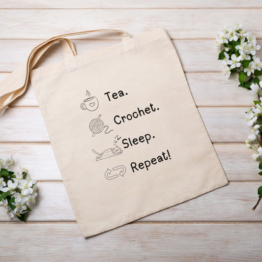 Tea. Crochet. Sleep. Repeat! Tote Bag by Brunaticality