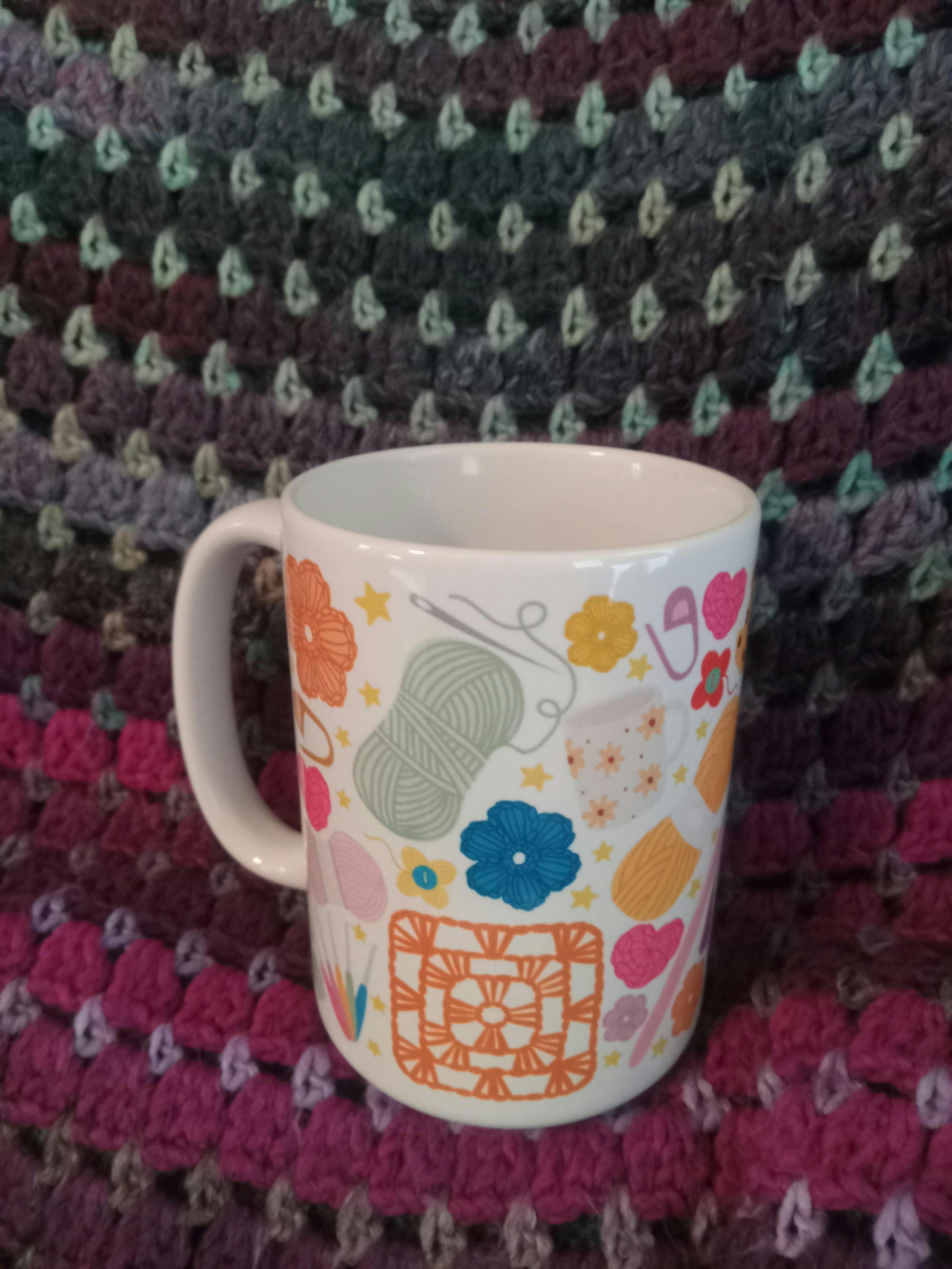Perfect for crochet lovers, this 15oz ceramic mug features a vibrant array of crochet related icons. Whether it's your morning coffee, a cozy hot chocolate or any warm beverage, this glossy white mug will brighten your day. It's microwave and dishwasher safe, ensuring the print stays vivid and beautiful with every use.