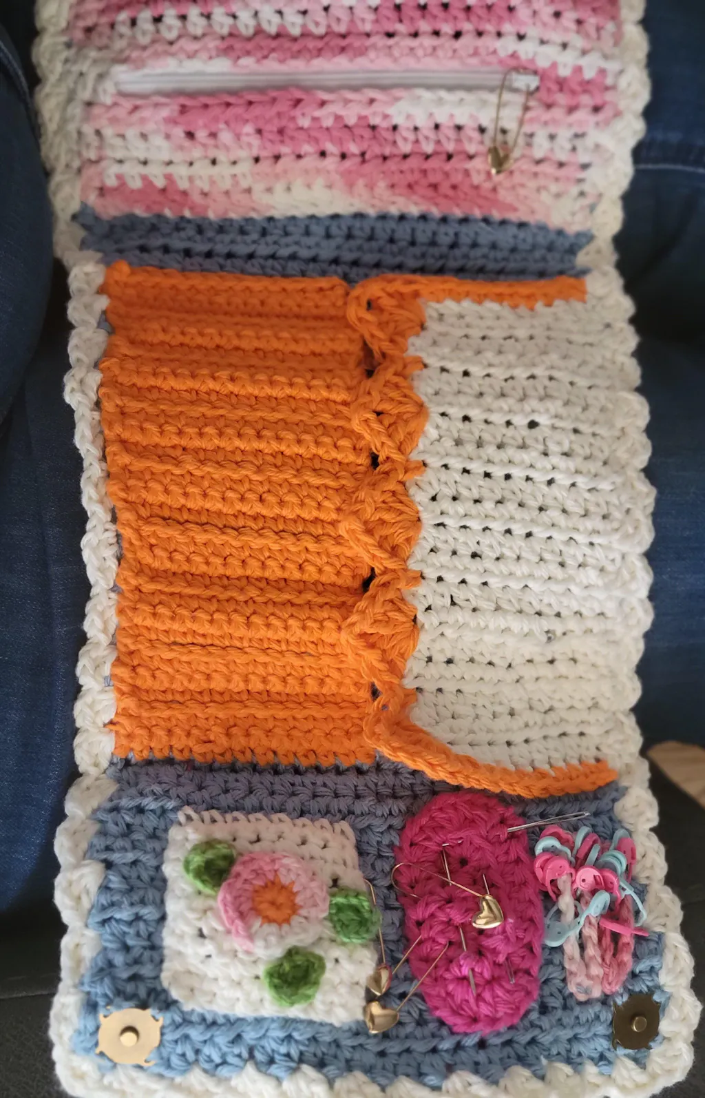 This PDF crochet pattern guides you through every step to create your own beautiful crochet hook organizer with pockets, a zipper section, a hidden pocket and decorative flower details. Designed for function and flair, this project makes the perfect gift for crocheters or a rewarding make for yourself!